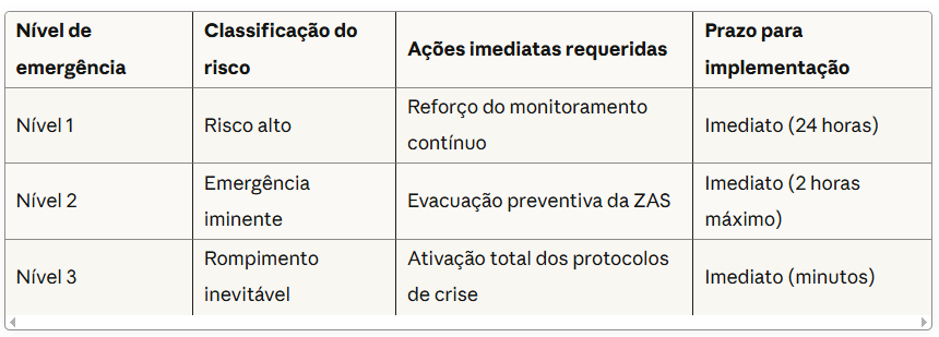 Os sistemas de emergência estruturam-se em níveis progressivos que demandam respostas imediatas. A tabela abaixo detalha as ações necessárias em cada fase crítica: